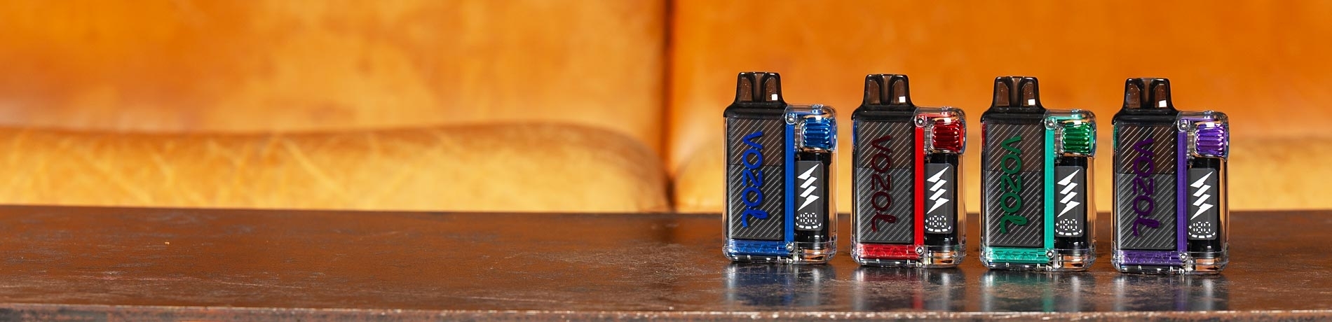 Ein auf Holz liegendes Einweg-Vape-Gerät, der Vozol Vista Plug, bestehend aus mehreren Teilen: ein durchsichtiger Hauptkörper mit der Aufschrift „Vozol“, ein schwarzer Mundstückaufsatz, ein herausnehmbarer schwarzer Anschluss, sowie eine orangefarbene Schutzkappe, die daneben liegt.