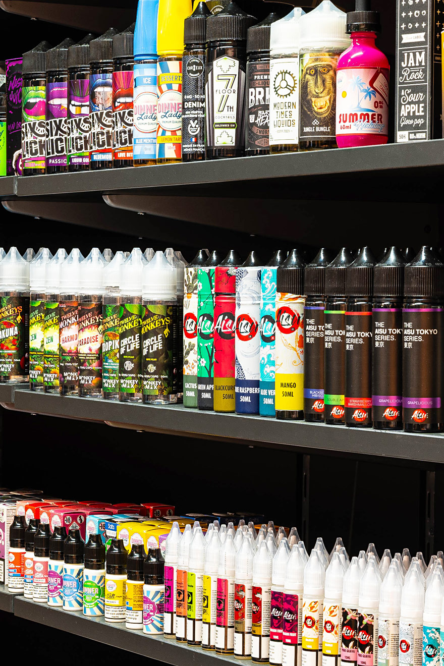 Nahaufnahme eines Regals mit zahlreichen E-Liquids und Nikotinsalzen im Smokee Baden, darunter Marken wie Twelve Monkeys, Aisu oder Dinner Lady.