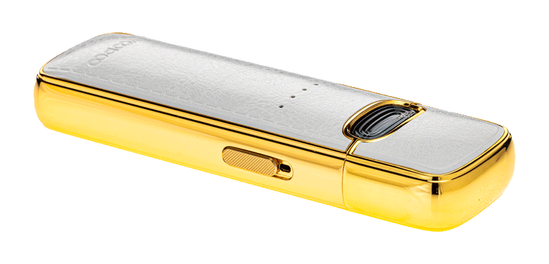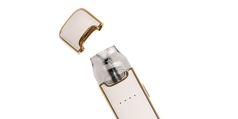 Entdecke das Pod-System Vmate-E im White Inlaid Gold Design. Mit seinem kraftvollen 1200 mAh Akku, dem 3 ml Liquidtank und der revolutionären 5-A-Frische-Versiegelungstechnik ist er der ideale Begleiter für unterwegs. Das goldene Metall sowie die weisse Lederoberfläche verleihen dem Vape eine elegante Optik. Mit den mitgelieferten Pods kannst du wählen, ob du lieber mit 0.7 und 1.2 Ohm Widerstand dampfen möchtest.